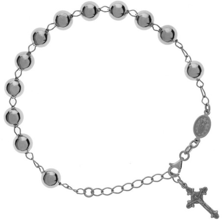 Náramek je vyroben ze stříbra ryzosti 925/1000. Povrchová úprava stříbra je ošetřena rhodiováním, které zabraňuje oxidaci (černění, žloutnutí a ztrátě lesku), díky čemuž náramek zůstane dlouho jako nový. Typ kuličky: hladká. Počet desátků na růženci: jeden. Výhodou u náramku je, že jeho délku můžete kdykoli měnit na kteroukoli z těchto hodnot: 22 cm, 23 cm, 24 cm a 25 cm. Náramek zdobí oboustranná Zázračná medailka Panny Marie a křížek s Ježíšem. Zapínání je na kvalitní a bezpečnou oválnou karabinu.